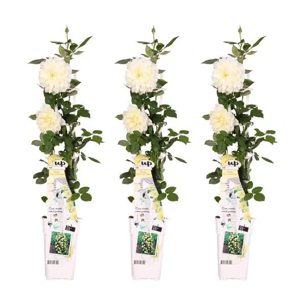 ‘Rosa Crazy in love Vanilla’ is een populaire crèmewitte klimroos met frisgroene glimmende bladeren. Rozen behoren al honderden jaren tot een van de bekendste en meest aangeplante groep planten. De roos heeft in verschillende culturen een symbolische waarde. Al in de oudheid werden er tempels en paleizen mee versierd. De roos begint te bloeien in juni en bloeit door tot aan de eerste vorst in oktober of november. Om het bloeien te stimuleren is het raadzaam om oude en uitgebloeide bloemen te verwijderen. De klimroos houdt van een zonnige standplaats, en voor de mooiste groei kun je hem het beste om het jaar tot zo’n 30 centimeter boven de grond terug snoeien.