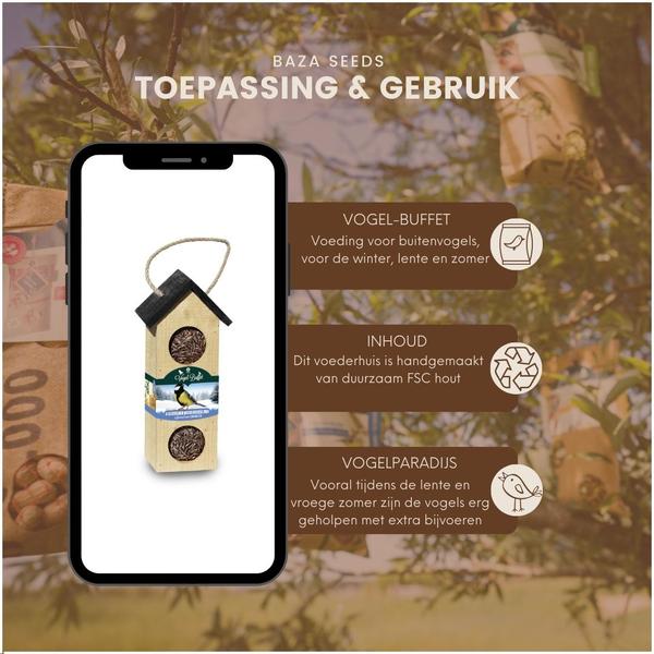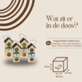 Inhoud: De Bird Chalet Mix set bevat 4 houten chalets, elk gevuld met 200 gram 4-seizoenen-voedsel, zorgvuldig samengesteld voor specifieke vogelsoorten: