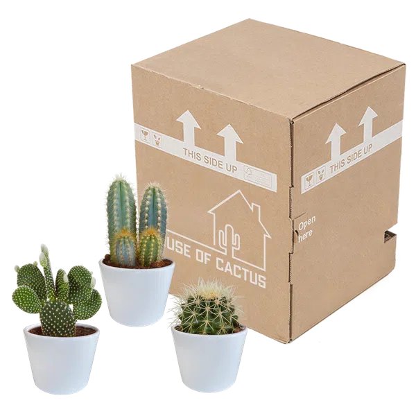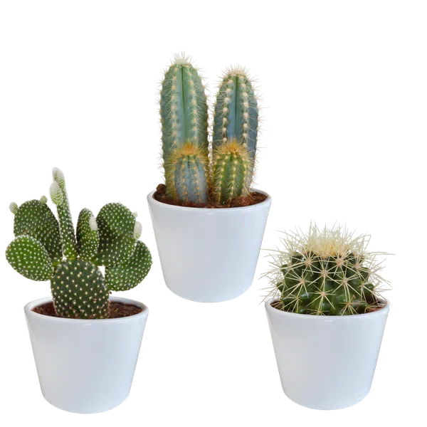 Zie hier een stekelige mix! Deze mix bestaat uit 3 cactussen die in kleur, hoogte én vorm van elkaar verschillen. De cactussen komen rechtstreeks van de kweker en zijn dus van de hoogste kwaliteit. Deze stekelige mix wordt geleverd in een witte pot.