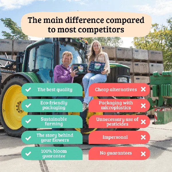 - Meer dan alleen bloembollen: elke bestelling komt samen met een hartverwarmend verhaal over Flowerbulbs Amsterdam en onze toewijding aan zowel botanische schoonheid als ecologische verantwoordelijkheid.