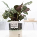 - De Ctenanthe Burle Marxii heeft ovale bladeren met opvallende donkergroene strepen en een paarse onderzijde.