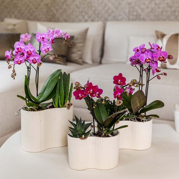 De orchidee wordt geleverd met 2 of 3 stevige takken, afhankelijk van de actuele beschikbaarheid. Omdat we met levende producten werken, kunnen er kleine variaties zijn in het aantal takken of bloemen.
