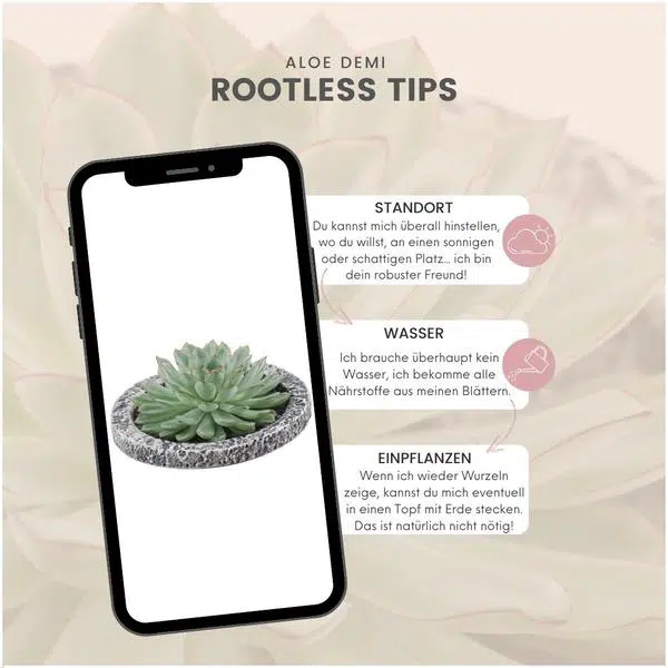 ROOTLESS succulents worden geteeld in een kweekpot en groeien tot het juiste formaat. Als het rozet van de plant groot genoeg is, dan wordt deze losgesneden van de potgrond. Een ROOTLESS kan een Echeveria, Aloe en Gasteria zijn. Andere namen voor ROOTLESS zijn snijvetplant, snijplant, snij-echeveria en snijsucculent.