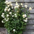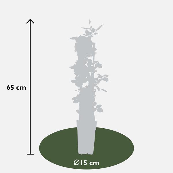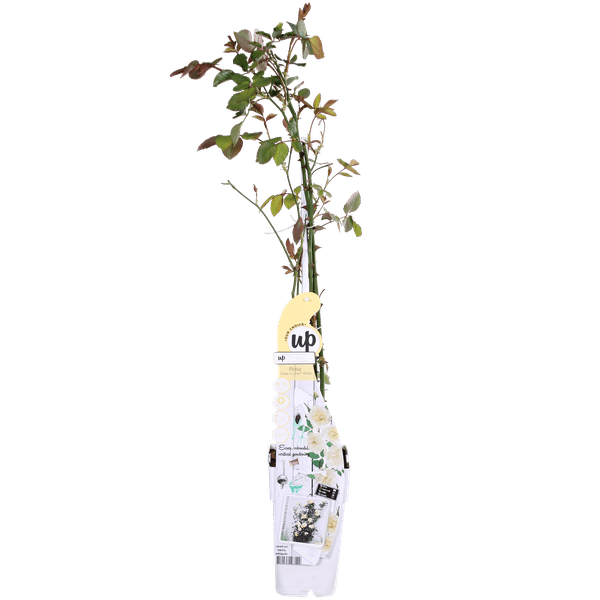‘Rosa Crazy in love Vanilla’ is een populaire crèmewitte klimroos met frisgroene glimmende bladeren. Rozen behoren al honderden jaren tot een van de bekendste en meest aangeplante groep planten. De roos heeft in verschillende culturen een symbolische waarde. Al in de oudheid werden er tempels en paleizen mee versierd. De roos begint te bloeien in juni en bloeit door tot aan de eerste vorst in oktober of november. Om het bloeien te stimuleren is het raadzaam om oude en uitgebloeide bloemen te verwijderen. De klimroos houdt van een zonnige standplaats, en voor de mooiste groei kun je hem het beste om het jaar tot zo’n 30 centimeter boven de grond terug snoeien.