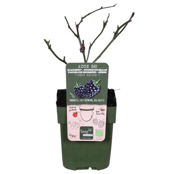 ‘Rubus Fruticosus Black Satin’ is een krachtig groeiende, doornloze zwarte braam. De struik heeft donkergroene, ovale, gekartelde bladeren. Hij heeft een lange oogsttijd en zorgt voor grote, glanzende vruchten die veel sap bevatten. Bramen zijn eerst groen, daarna kleuren ze rood en op het laatst nemen ze die mooie donkere paars-zwarte kleur aan. Ze zitten vol mineralen en zijn zoet van zichzelf. Dat de struiken geen stekels hebben heeft geen invloed op de smaak van de vrucht, wel zijn ze zonder stekels kindvriendelijker.