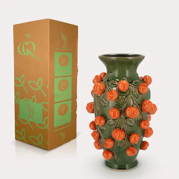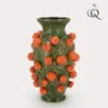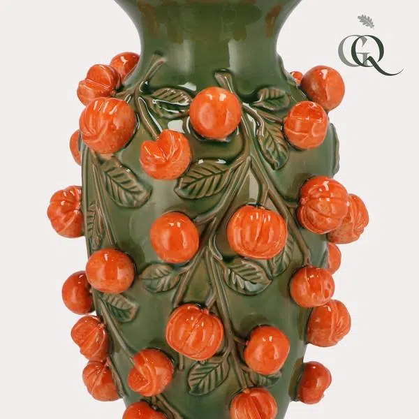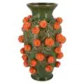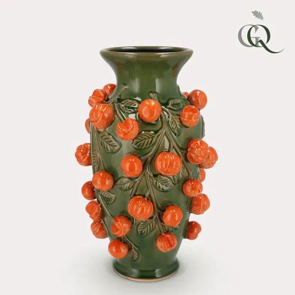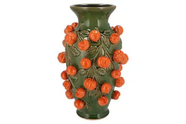 Haal een blikvanger in huis met deze schitterende aardewerk vaas! Wat deze vaas extra bijzonder maakt, zijn de vruchten die erop zitten. Met dit pronkstuk in je interieur maak je keer op keer indruk. De prachtige kleur in combinatie met de oranje vruchten maken dit item trendy en sfeervol.