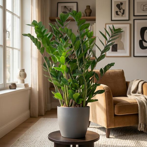 De Zamioculcas zamiifolia (ZZ plant of Emerald palm) is een ijzersterke kamerplant die met lange stengels en zijn prachtige glimmende bladeren op elke standplaats kan worden neergezet. Makkelijk in verzorging! Het is een makkelijke stoere kamerplant, die het goed doet in elk interieur! Wil jij meer groen in huis, maar heb je nog niet echt groene vingers? Dan is de Zamioculcas een goede keuze.
